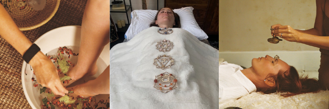 With sound, crystals, Pranic touch healing, intuitive messages from the flowers+ somatic practices.